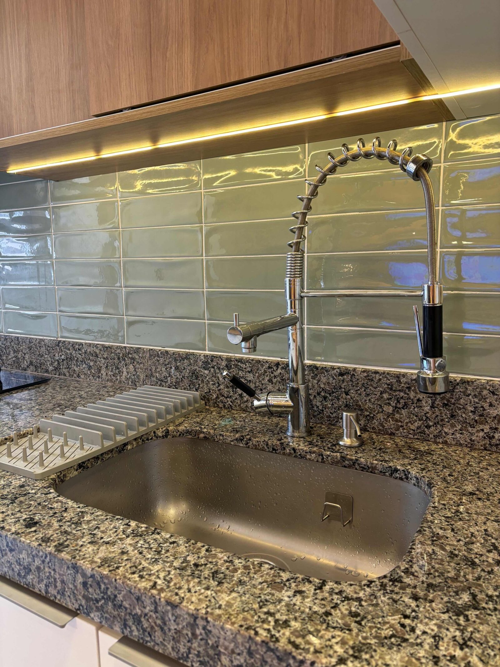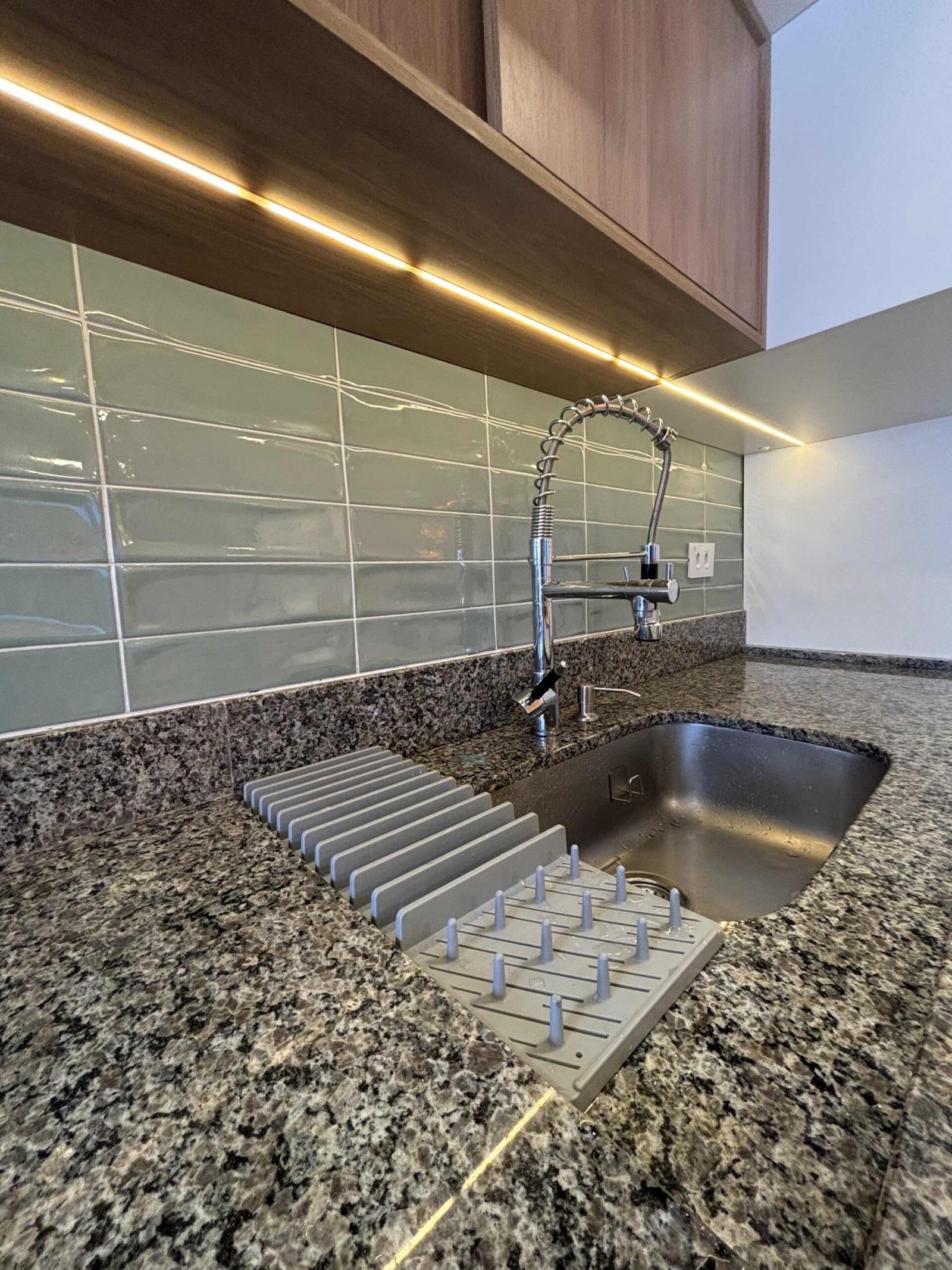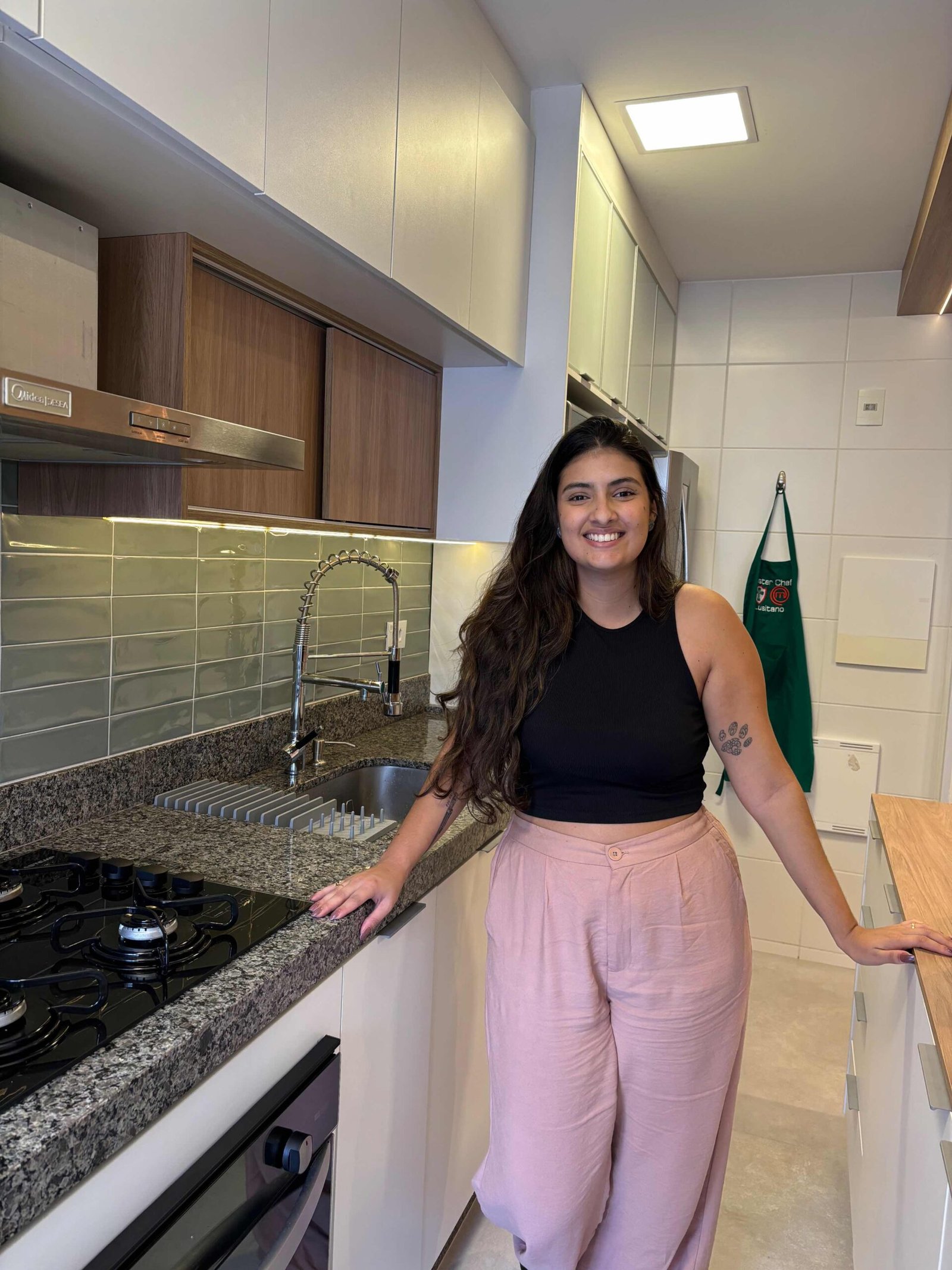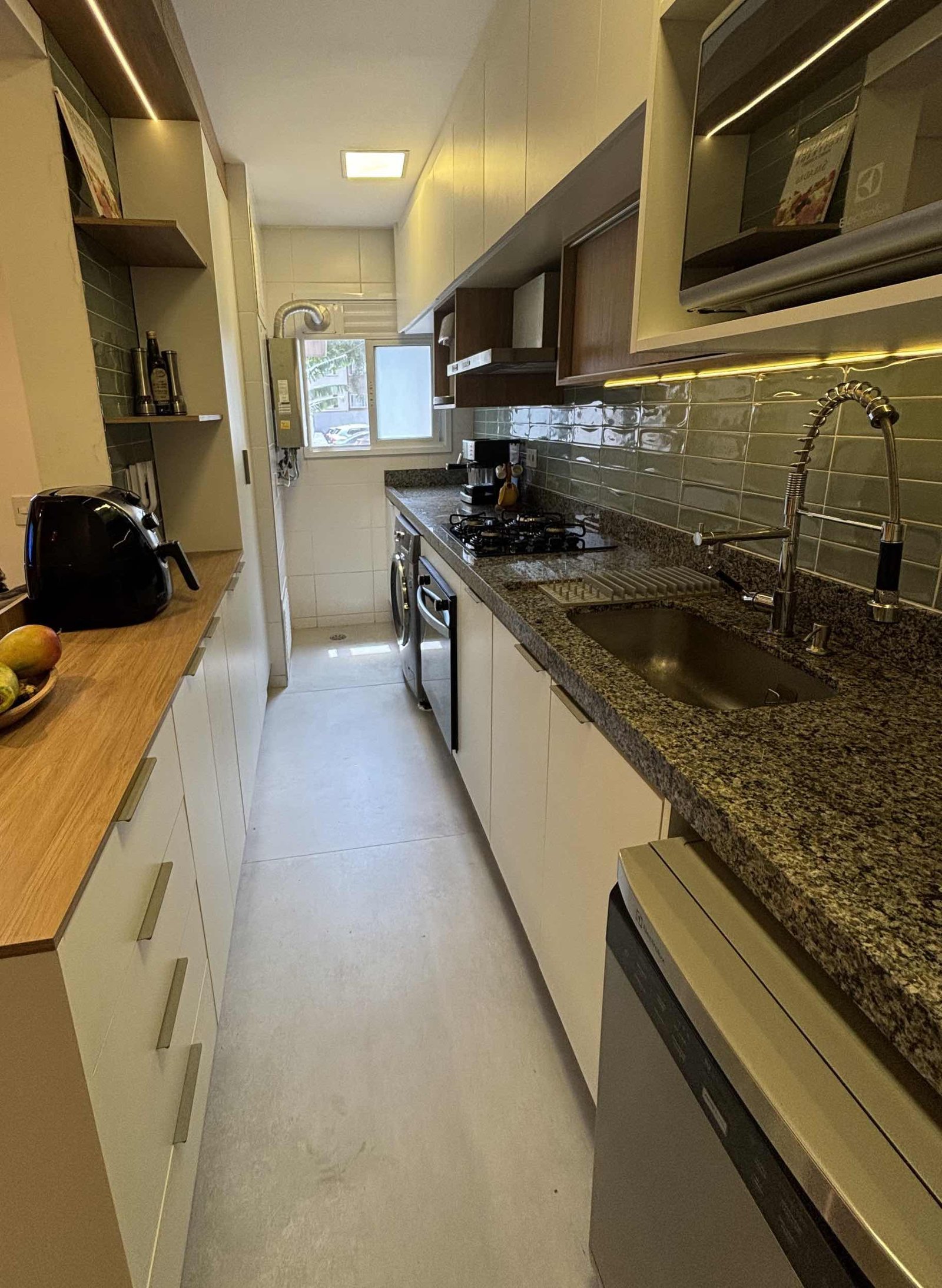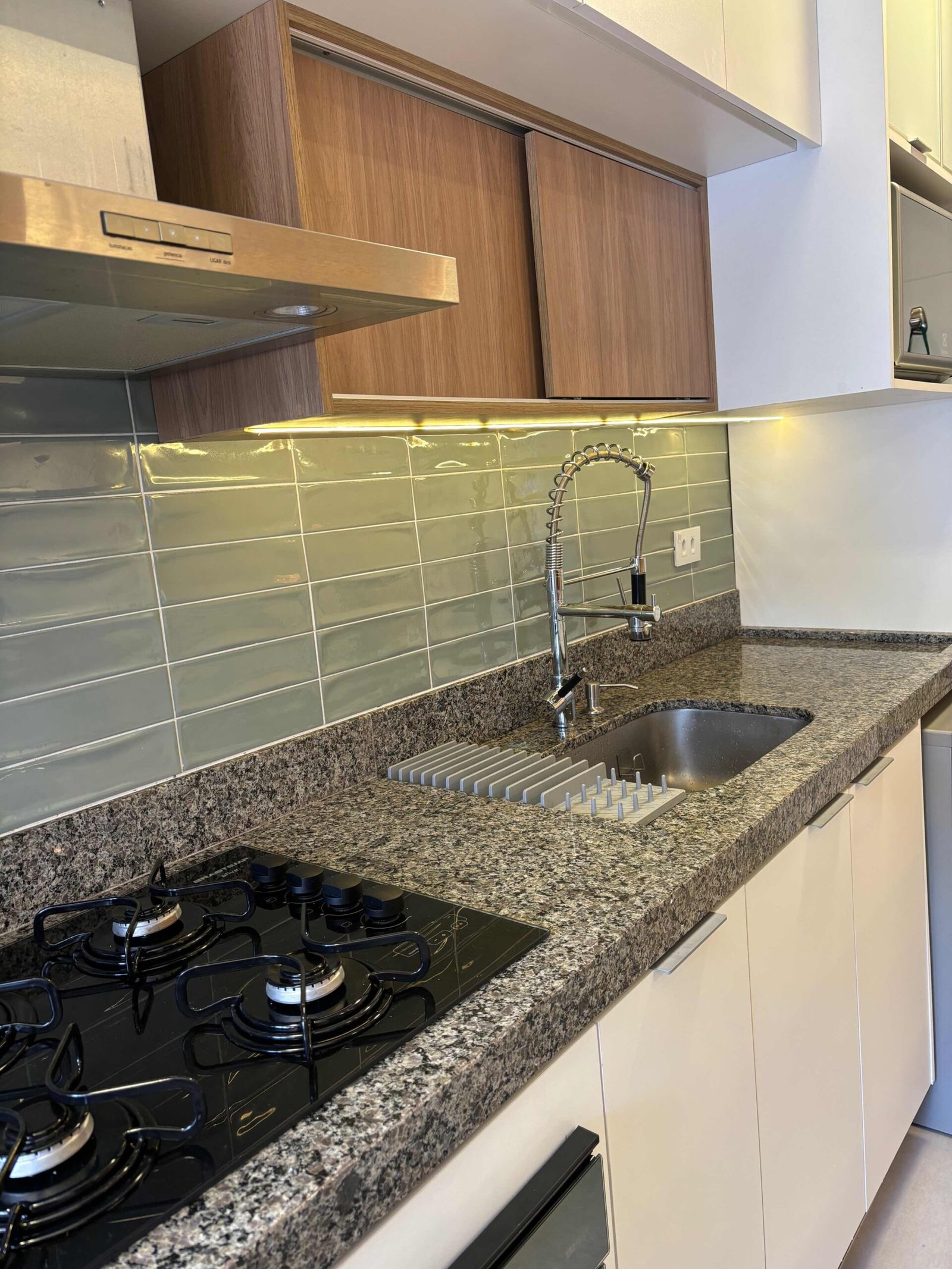 A cozinha nature foi desenvolvida para uma família que adora cozinhar. No piso foi usado revestimento de grande formato onde temos o mínimo de espaçamento entre as peças dando um ar de continuidade. Já na parede colocamos o revestimento em tijolinho verde que junto com o granito nos remete ao rio e suas pedras. A marcenaria é inteligente toda pensada no dia a dia do casal com as cores amadeirada e branca dão continuidade ao ambiente com muita personalidade. A falta de iluminação era um dos principais problemas no espaço, portanto adicionamos dois pontos de iluminação com fita de Led na marcenaria, um ponto em cima da pia e outro que se estende em um fechamento superior iluminando por completo a área de trabalho da bancada em madeira.